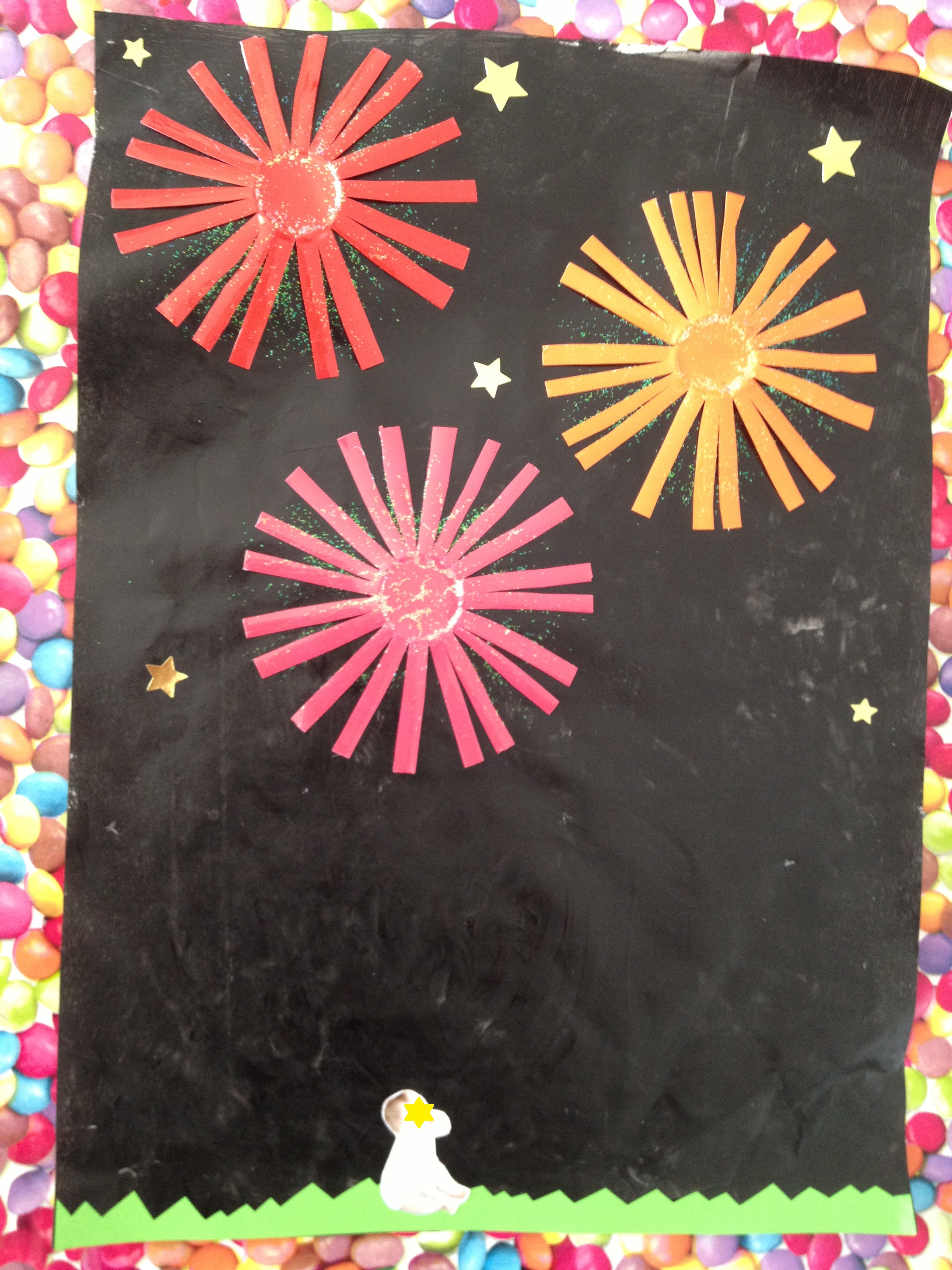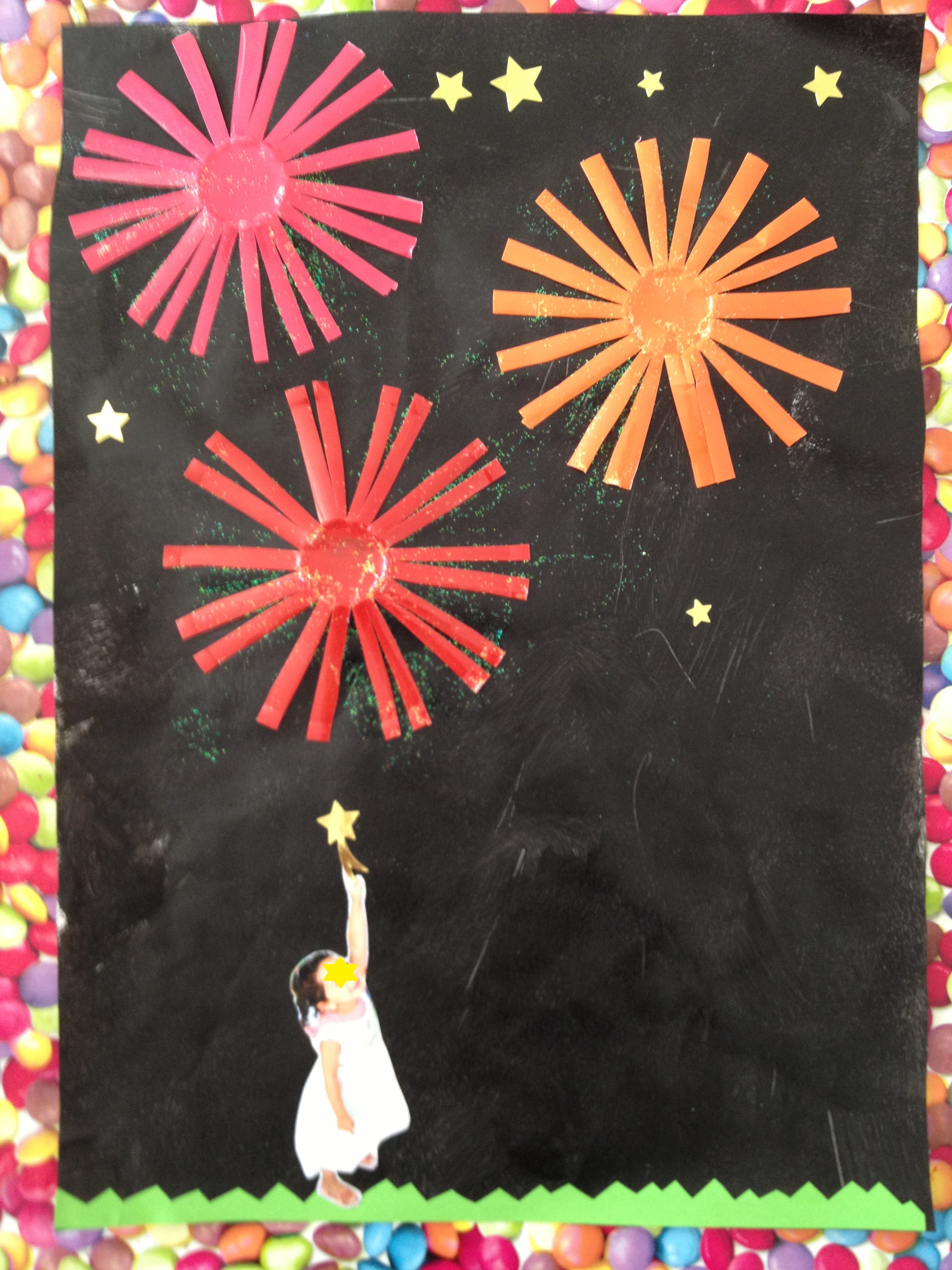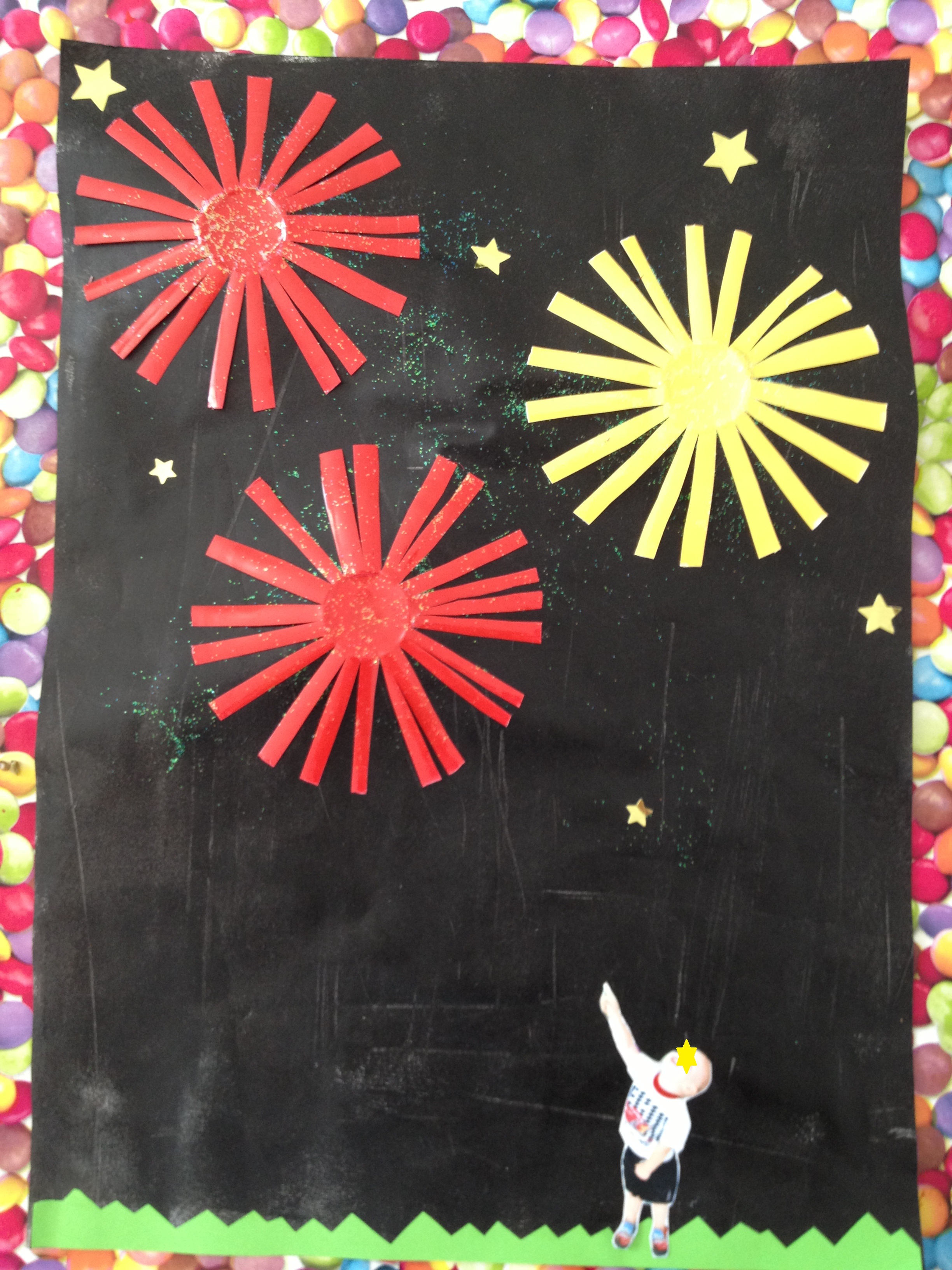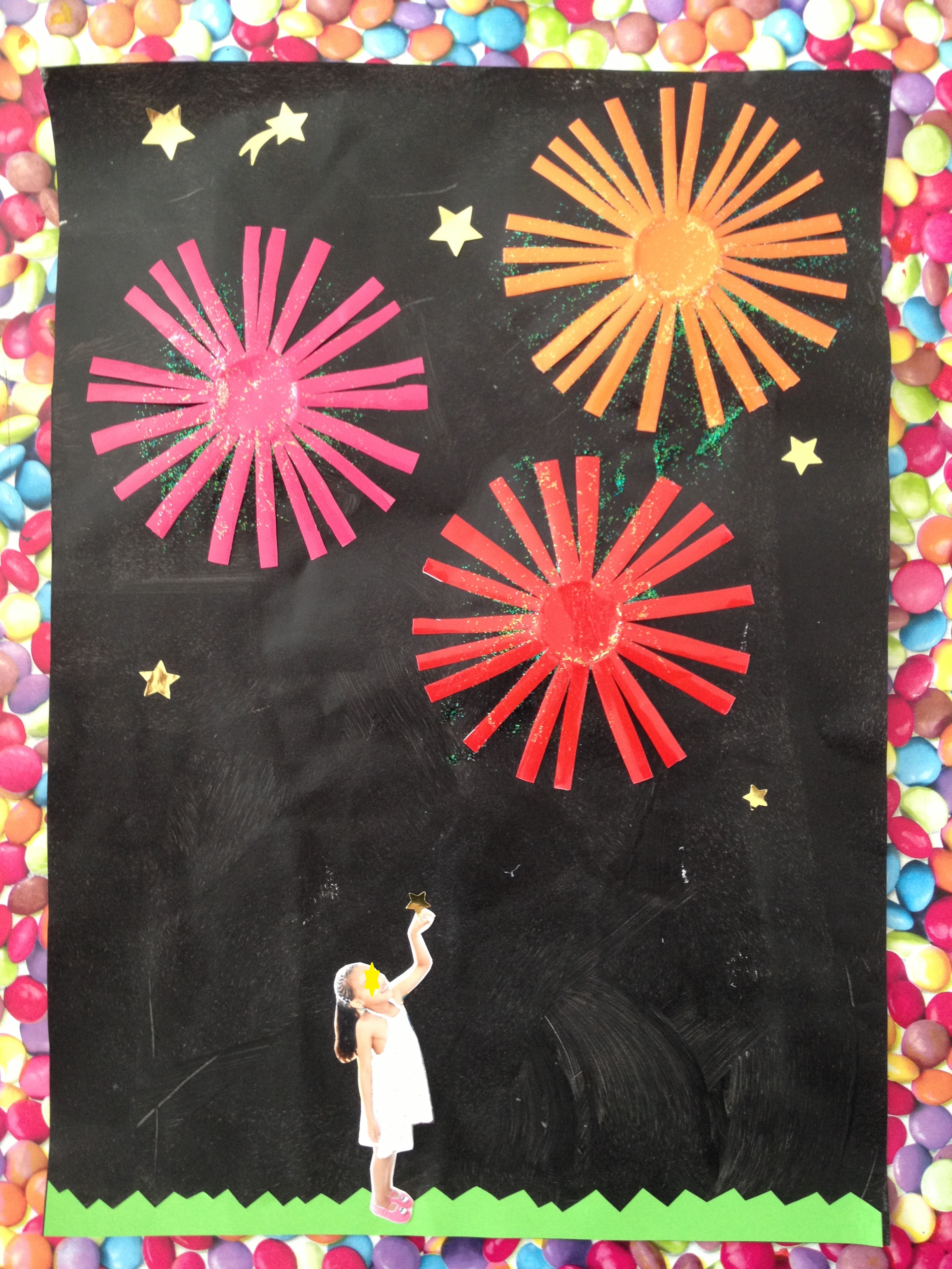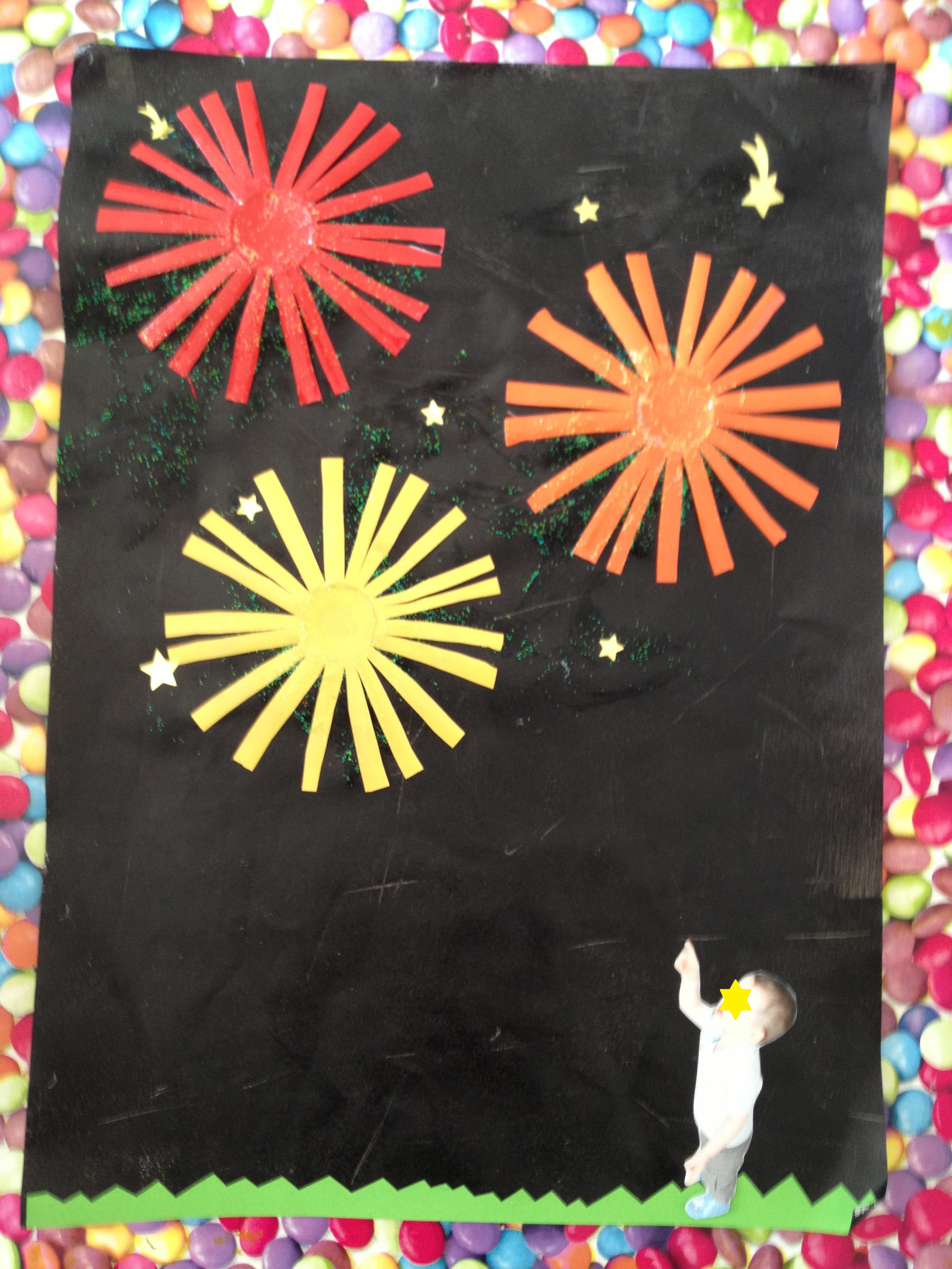 Feu d'artifice fait avec des petits suisses, feuille peinte en noir, gommettes étoiles et paillettes (idée vue sur le blog de Nounoudunord : http://nounoudunord.centerblog.net/rub-activite-feu-artifice-.html) :