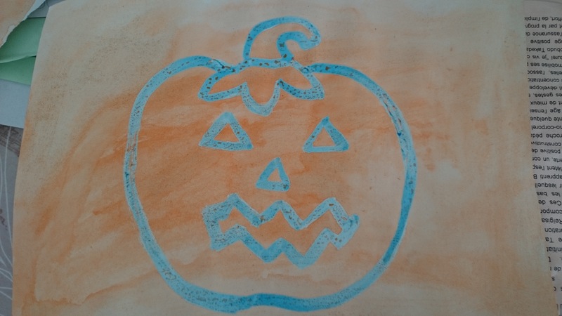 1. Dessiner une citrouille avec le liquide à masquer puis laisser sécher. Lorsque c'est bien sec peindre toute la feuille avec de la gouache diluée dans l'eau.